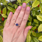 Handmade sterling silver beaded stretch ring with a small blue glass evil evil bead charm.