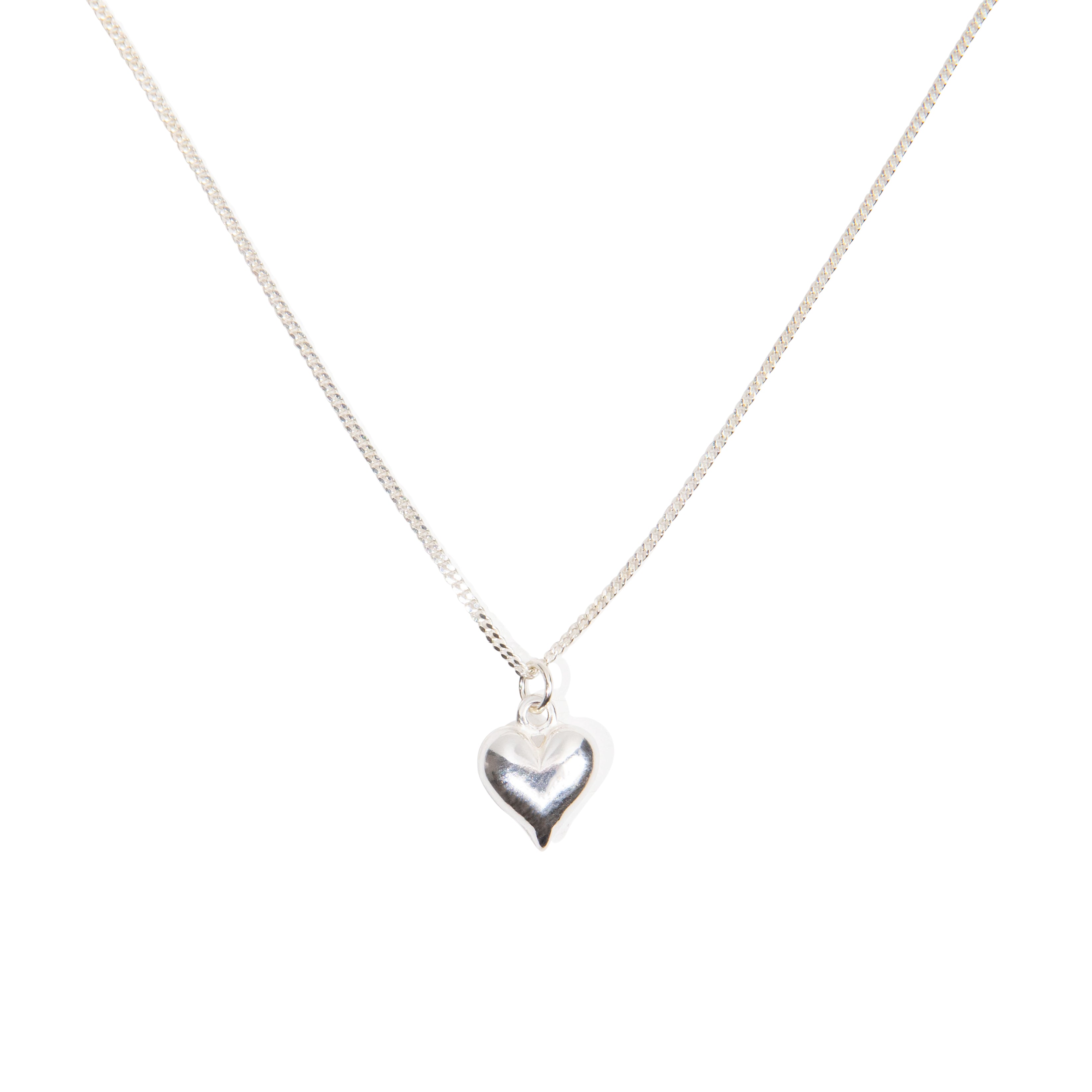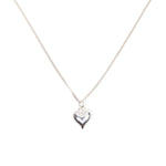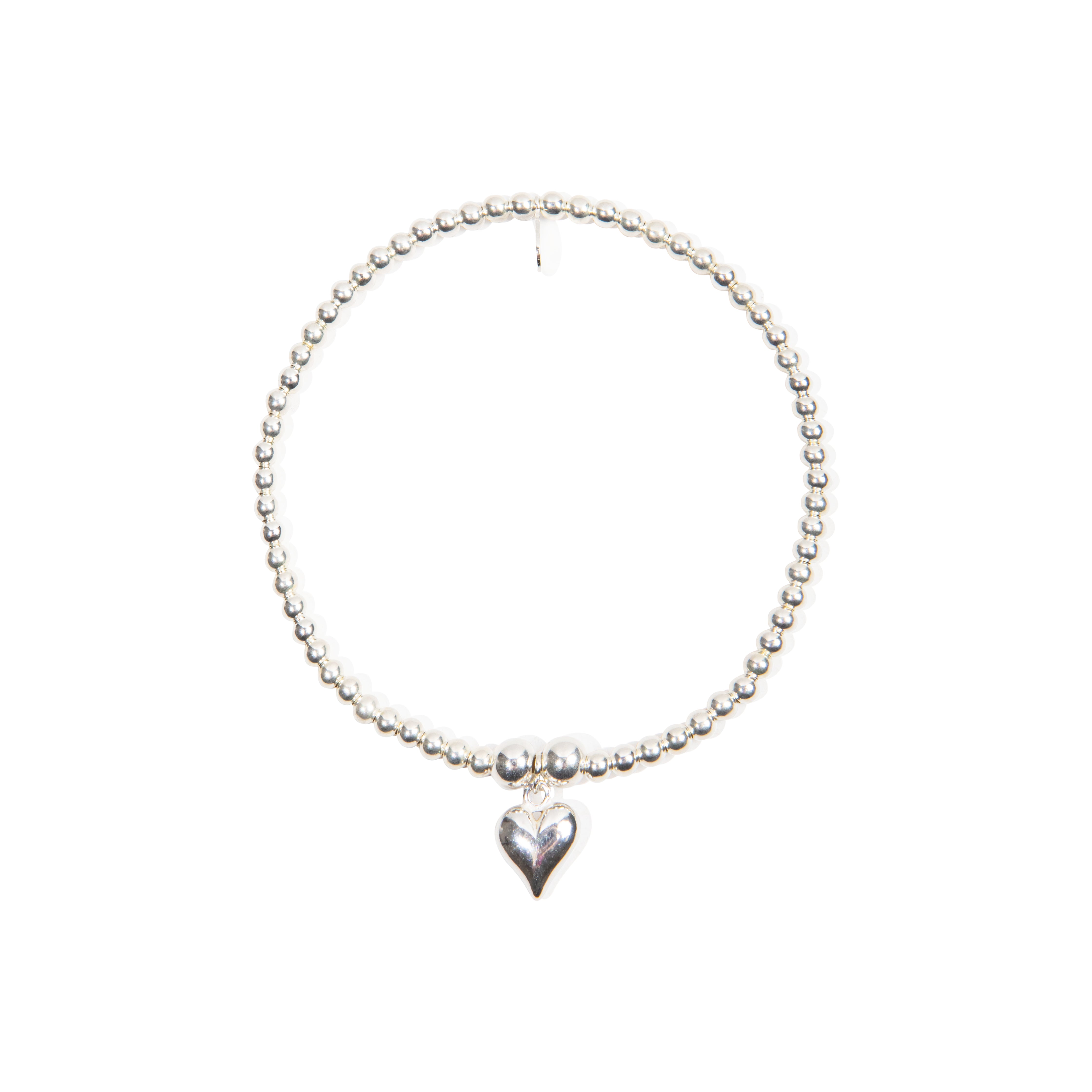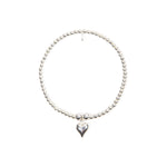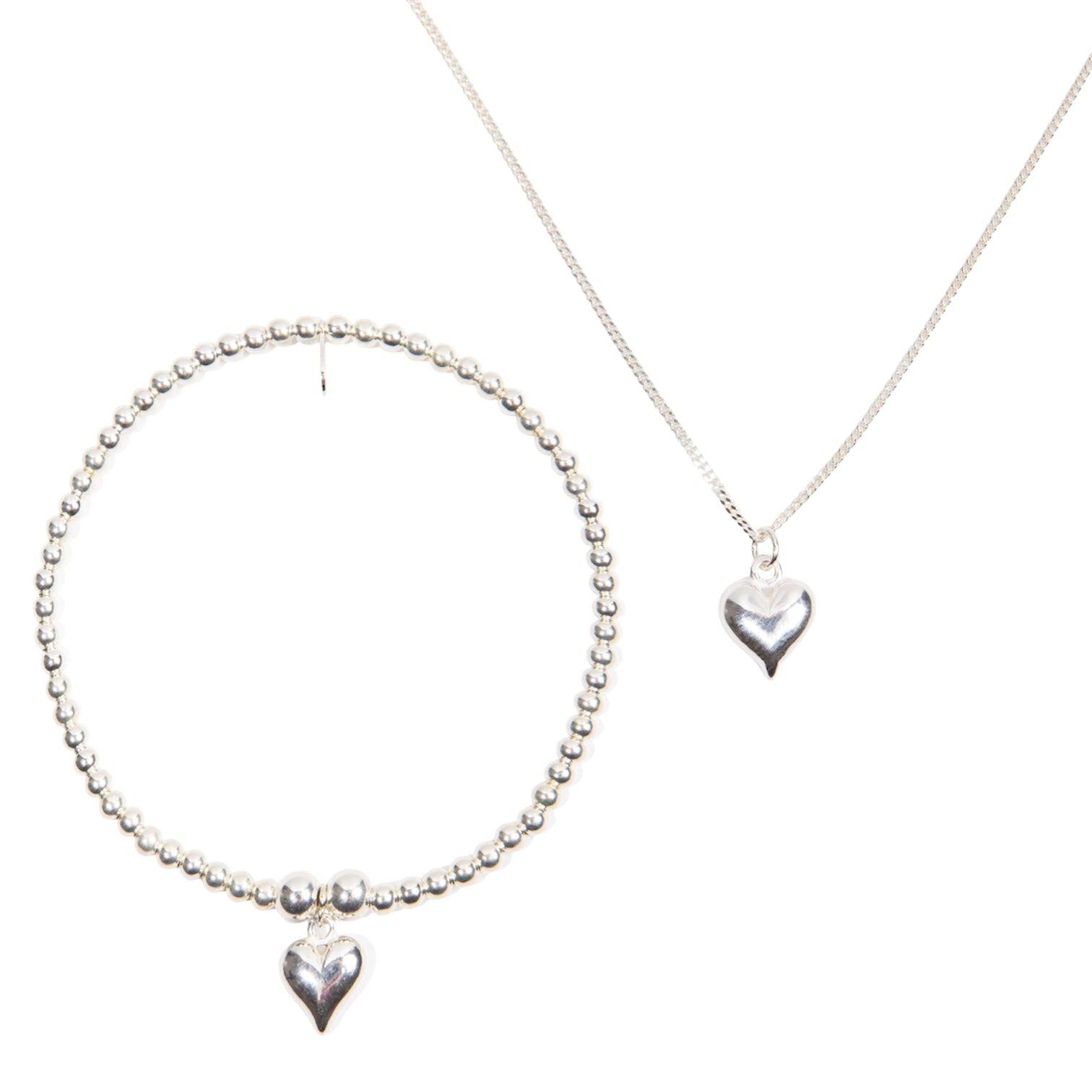 Handmade sterling silver jewellery set of a beaded stretch bracelet with a delicate puffed heart charm and a 925 sterling silver tag, and a matching necklace.