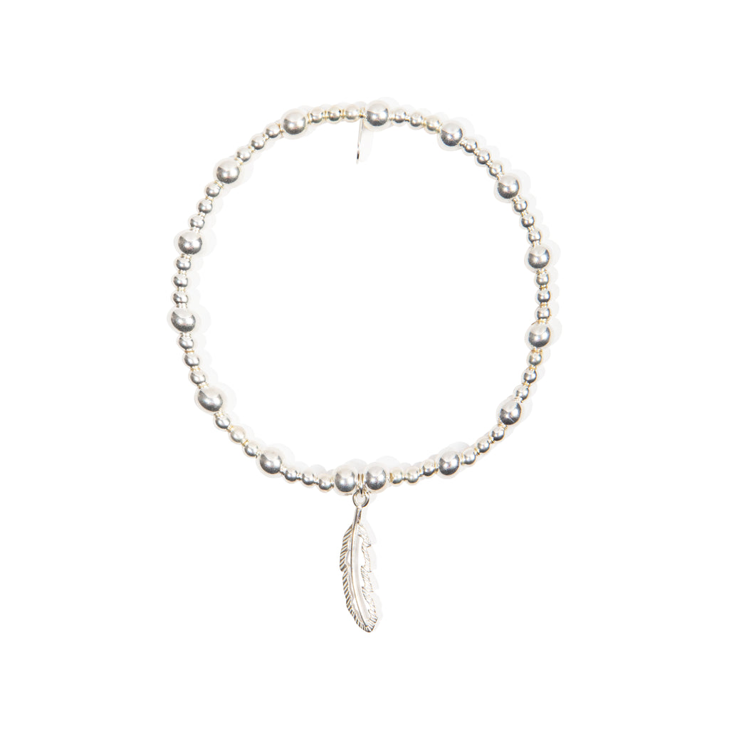 Handmade sterling silver beaded stretch bracelet with a delicate filigree feather charm and a 925 sterling silver tag.