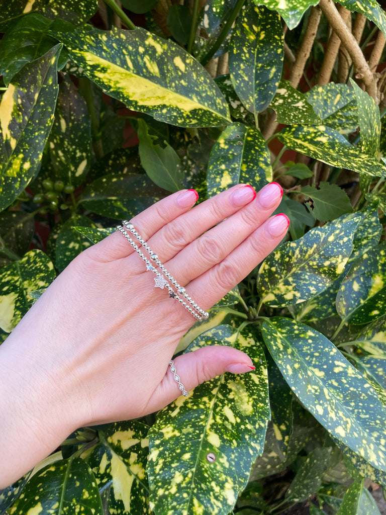 Handmade sterling silver beaded stretch bracelet using 3mm beads thread onto strong stretch elastic with four small sterling silver Star bead charms and a 925 sterling silver tag.