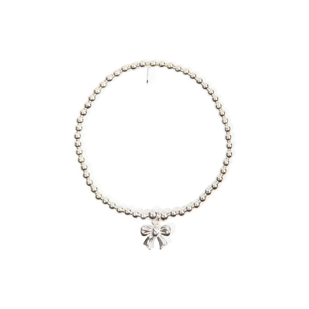 Children's handmade sterling silver beaded stretch bracelet with a small bow charm and a 925 sterling silver tag.