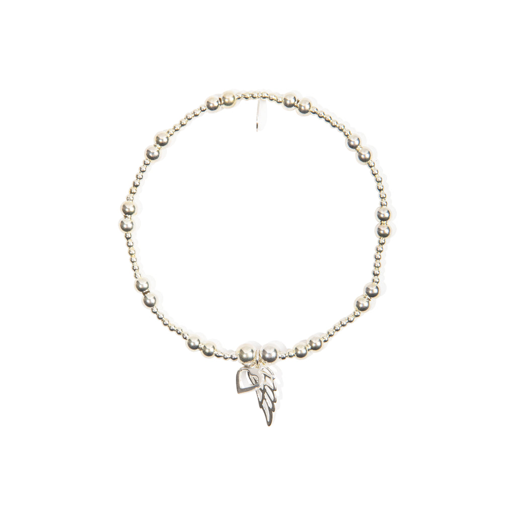 Handmade sterling silver beaded stretch bracelet with a delicate small angel wing and open heart charm and a 925 sterling silver tag.