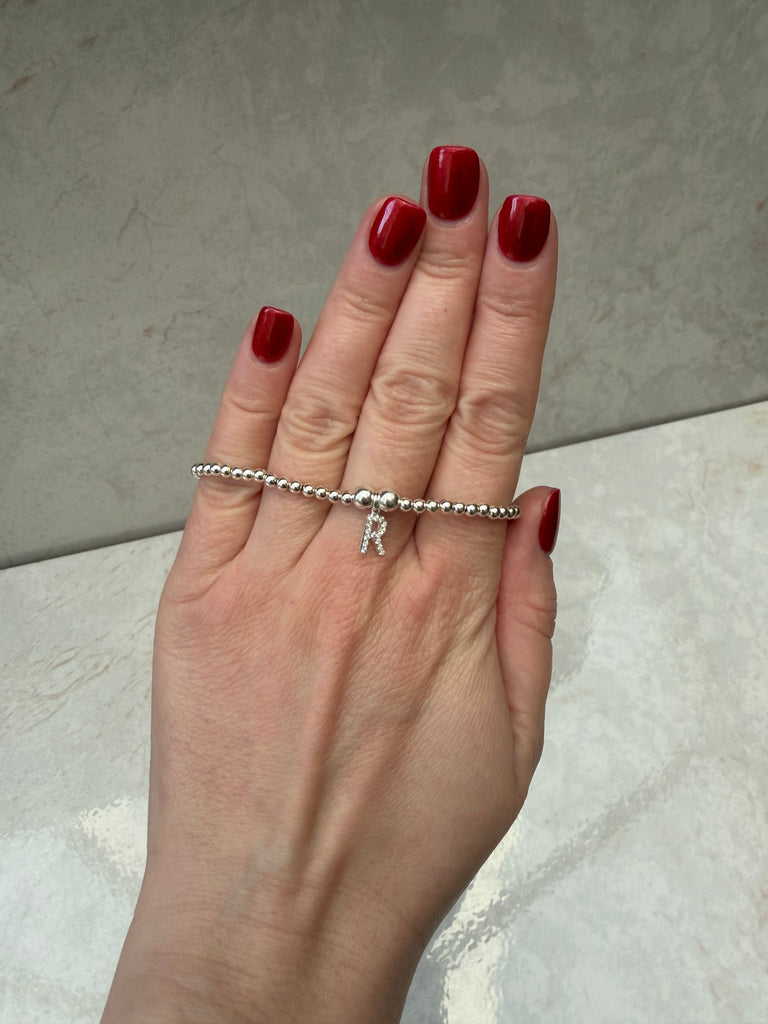 Handmade sterling silver beaded stretch bracelet using 3mm beads thread onto strong stretch elastic with a sterling silver & cubic zirconia initial charm and a 925 sterling silver tag.