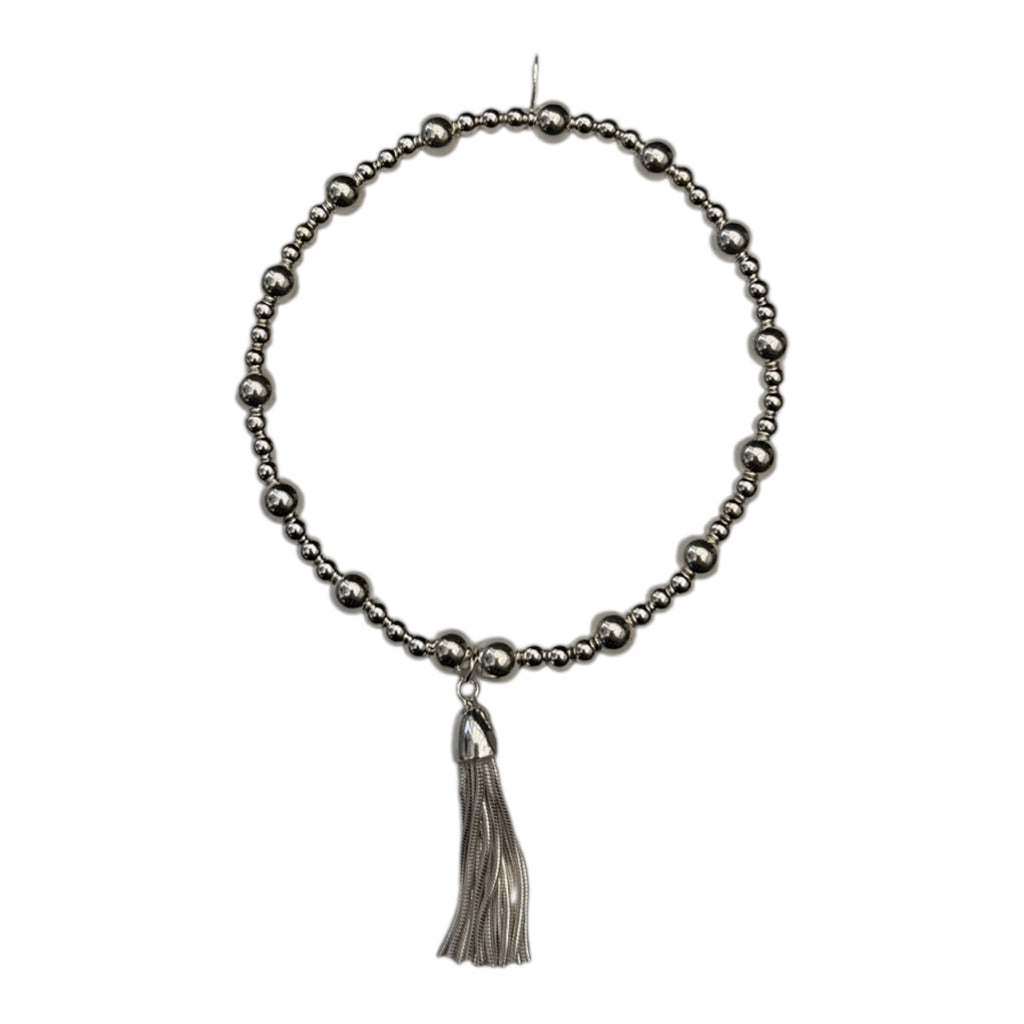 Handmade sterling silver beaded stretch bracelet using 3mm and 5mm beads thread onto strong stretch elastic with a sterling silver Tassel charm and a 925 sterling silver tag.