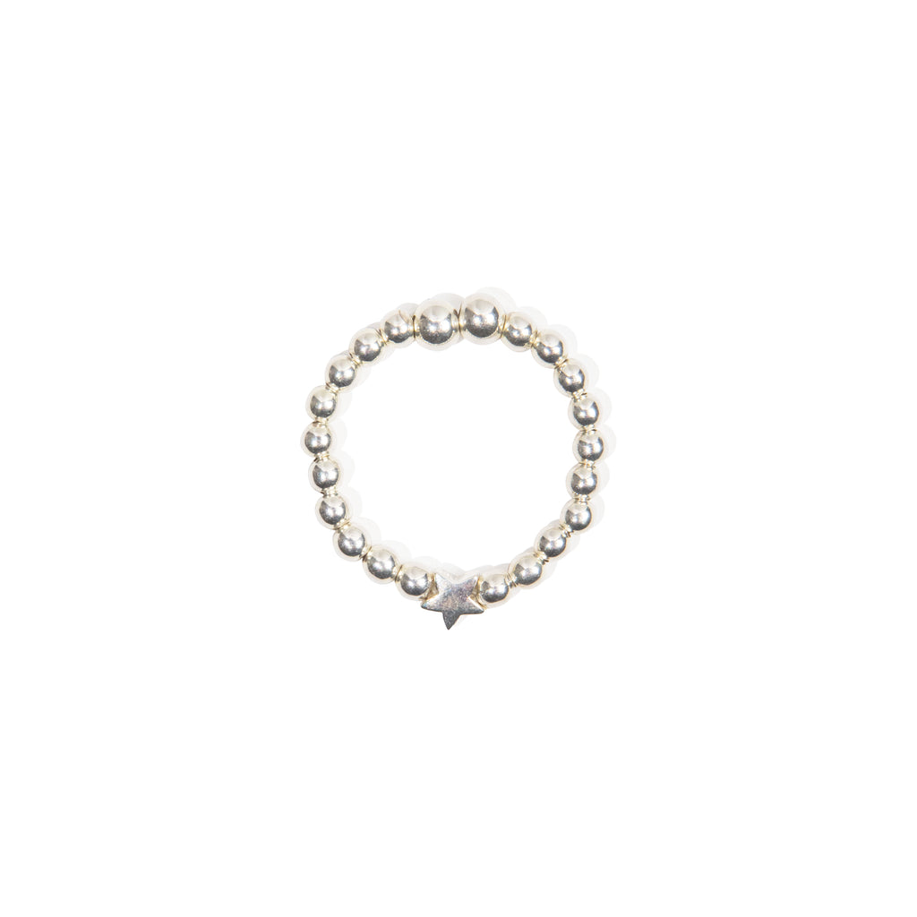 Handmade sterling silver beaded stretch ring with a small star bead charm.