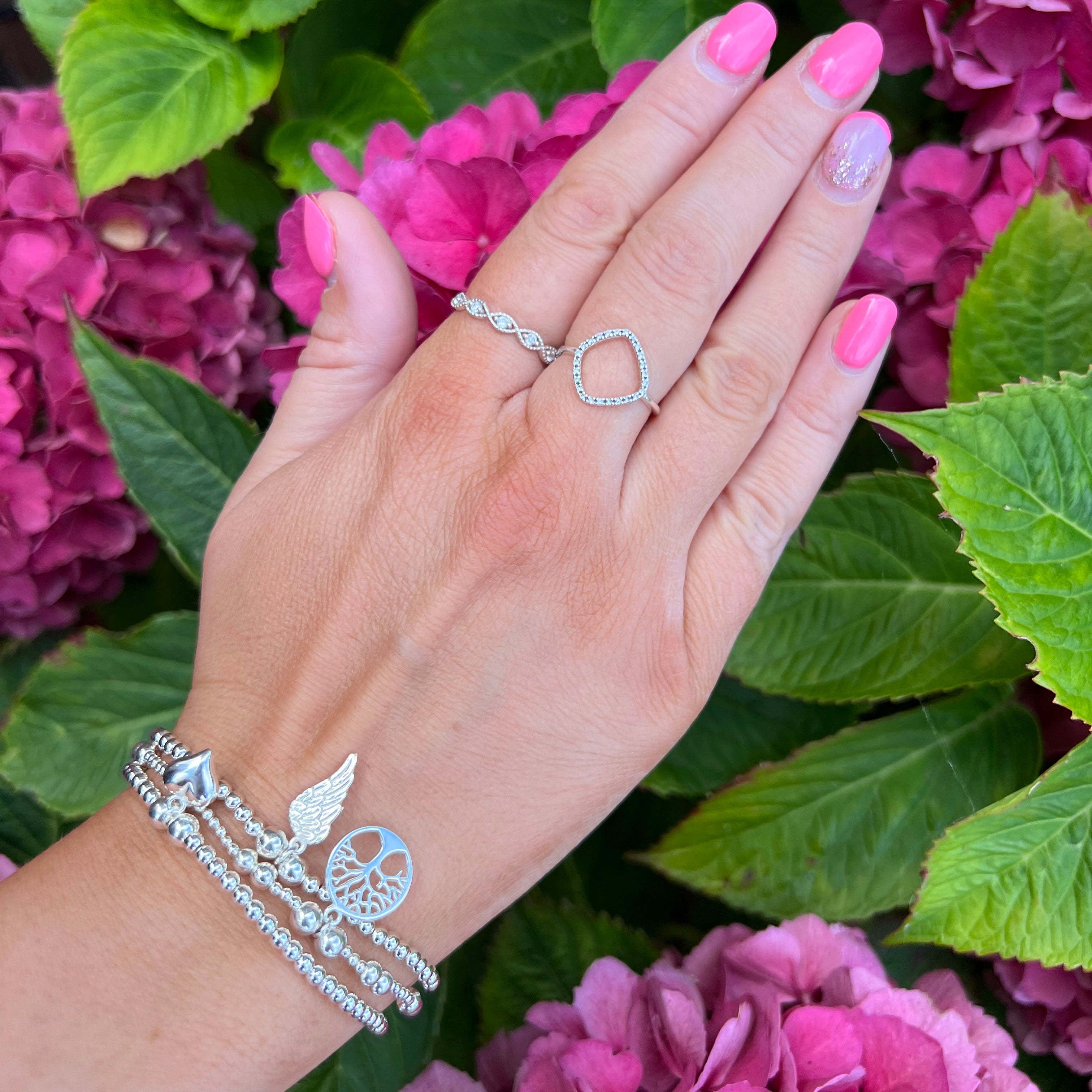 Handmade sterling silver beaded stretch bracelet with a delicate tree of life charm and a 925 sterling silver tag.